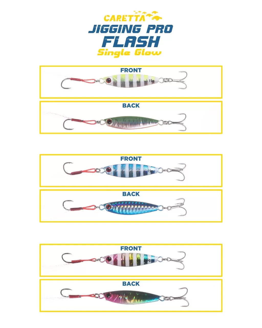 Caretta Jigging Pro Flash serisi, üç farklı renk varyasyonu ile üretilmiş olup, micro jig ve shore jig avlarınız için özel olarak tasarlanmıştır. Yavaş salınım aksiyonu sayesinde avlarınızın ilgisini en üst seviyeye çıkararak, vazgeçilmez bir yem haline gelmeyi hedefler.