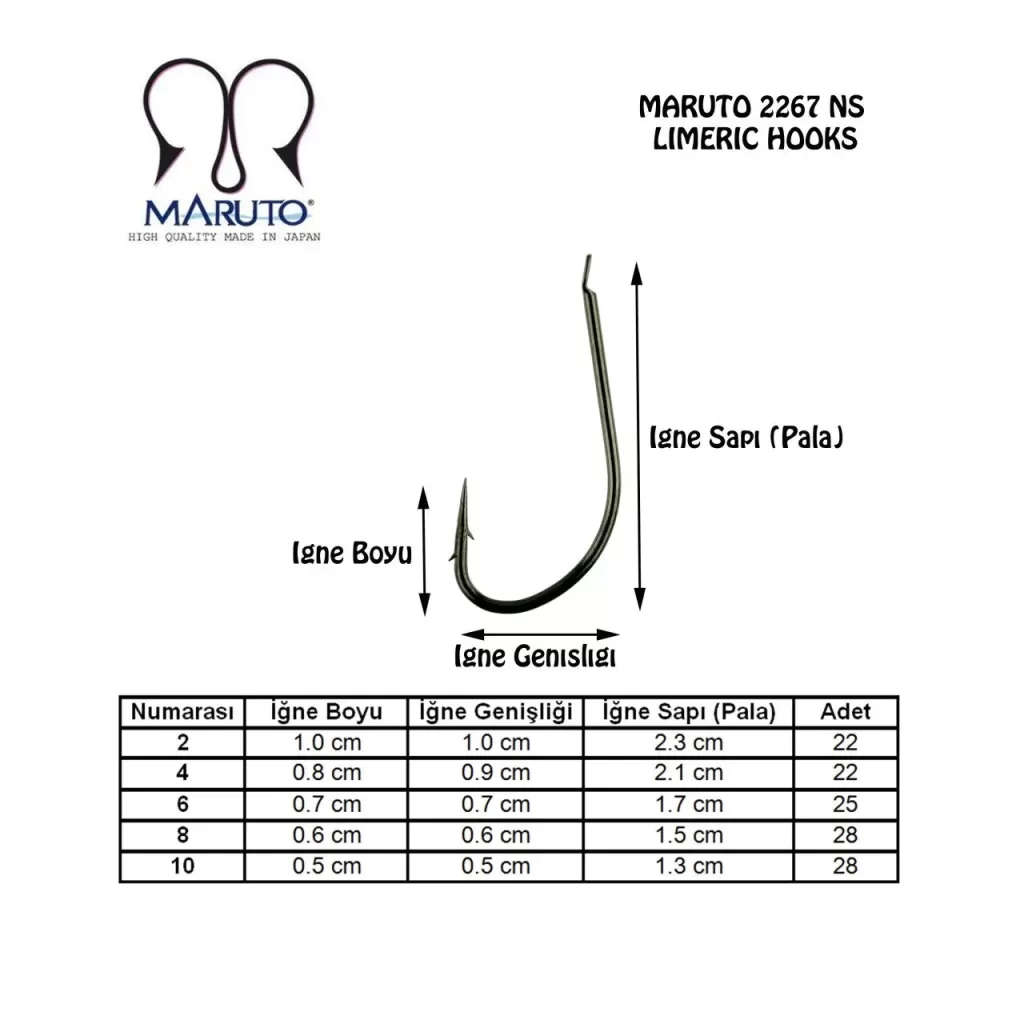 Maruto 2267 İğneleri Siyah Nikel renk, Kısa pala ve çapraz dövme iğne yapısına ek olarak iğne ucuna dizayn edilmiş çift tırnak sayesinde balıkların yemi yuttuklarında birlikte kolayca takılabilme özelliğine sahiptir.